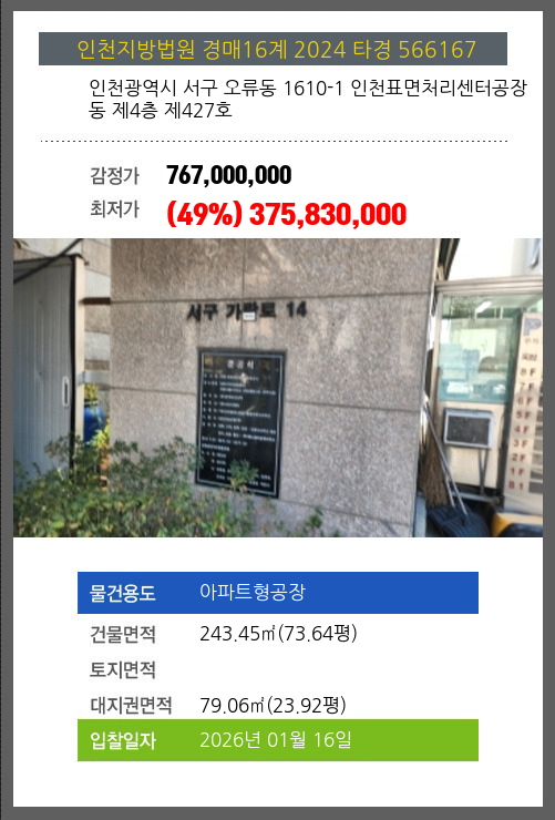 본건은 인천광역시 서구 오류동 1610-1 인천표면처리센터공장동 제4층 제427호