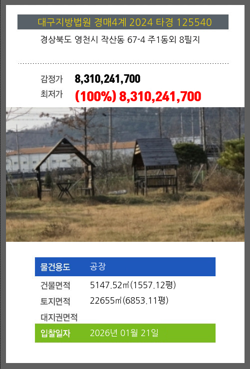 | 용도 | 공장 | 채권자 | 유** | 감정가 | 8,310,241,700 |