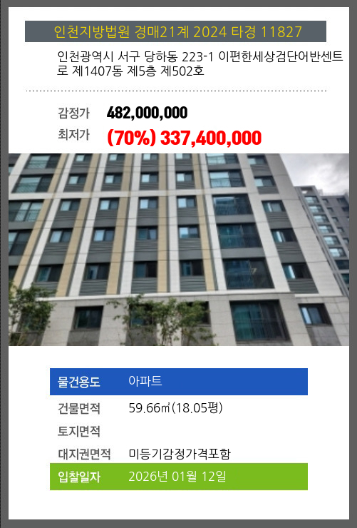 본건은 인천광역시 서구 당하동 223-1 이편한세상검단어반센트로 제1407동 제5층 제502호
