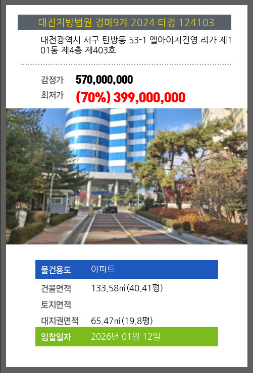 본건은 대전광역시 서구 탄방동 53-1 엘아이지건영 리가 제101동 제4층 제403호