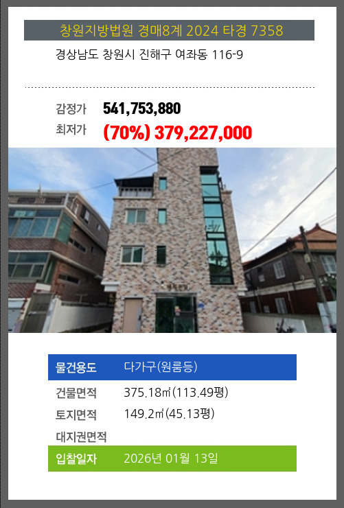 | 건물면적 | 375.18㎡ (113.49평) | 채무자 | 김** | 최저가 | (70%) 379,227,000 |