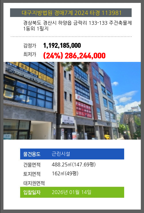| 소재지 | [지번] 경상북도 경산시 하양읍 금락리 133-133 주건축물제1동외 1필지 [도로명 주소] 경상북도 경산시 하양읍 대학로305길 24 주건축물제1동외 1필지 |