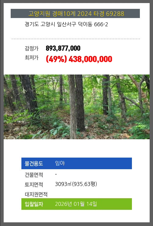 | 토지면적 | 3093㎡ (935.63평) | 소유자 | 임**외6명 | 보증금 | (10%) 43,800,000 |