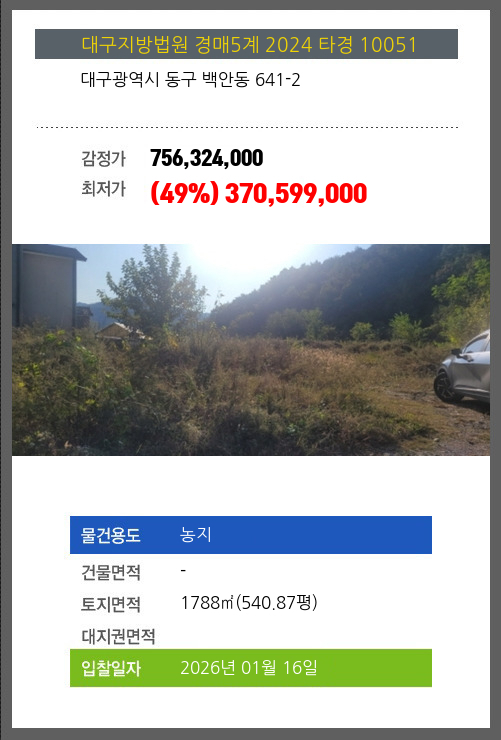 | 용도 | 농지 | 채권자 | 공** | 감정가 | 756,324,000 |