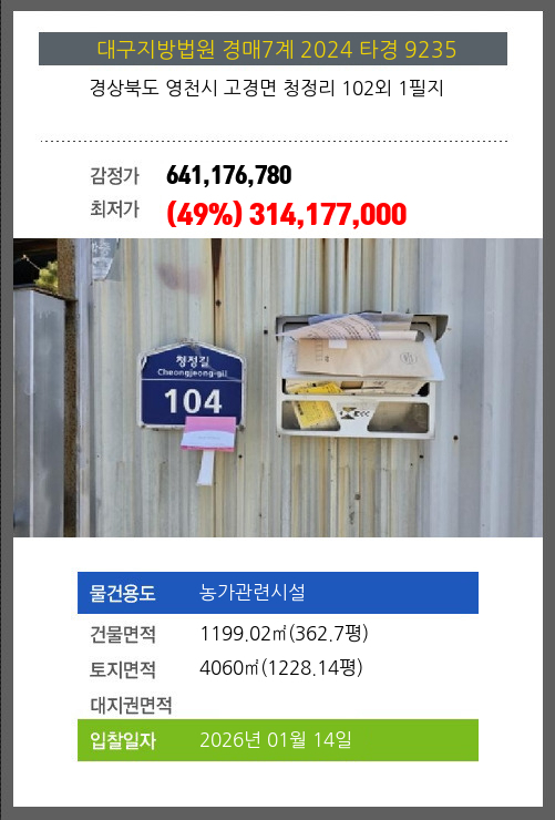 | 소재지 | [지번] 경상북도 영천시 고경면 청정리 102외 1필지 [도로명 주소] 경상북도 영천시 고경면 청정길 104외 1필지 |
