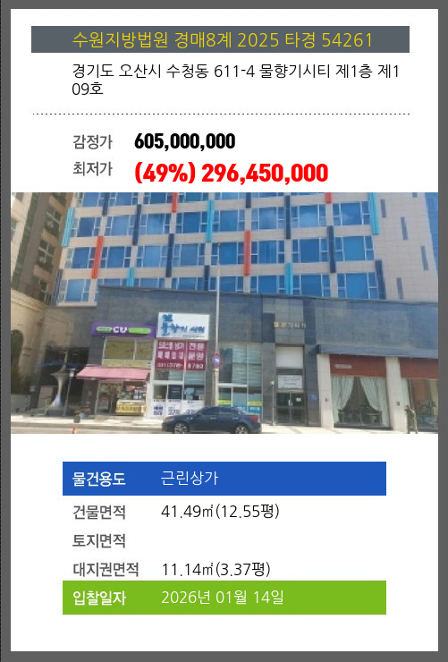 오산상가경매 오산시 수청동 611-4 물향기시티 제1층 제109호 №2025 타경 54261