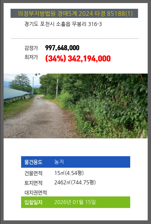 포천농지경매 포천시 소흘읍 무봉리 316-3 №2024 타경 85188(1)