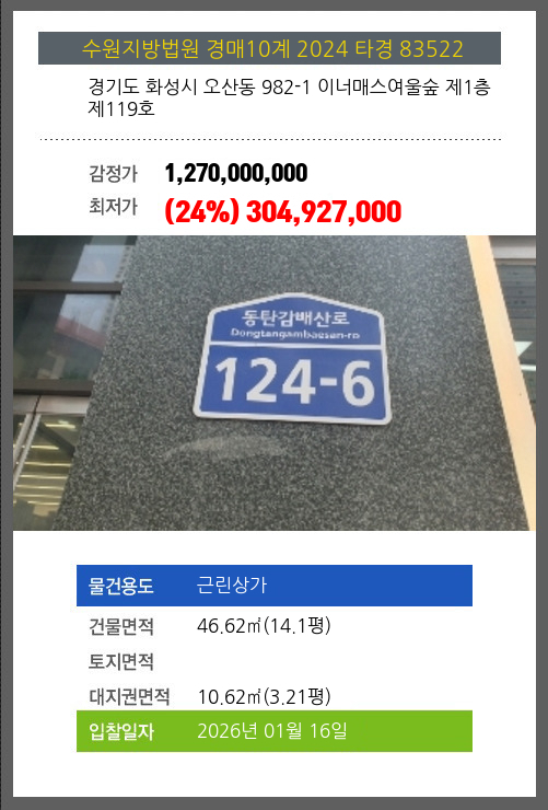 건물면적 46.62㎡ (14.1평) 채무자 ㈜** 최저가 (24%) 304,927,000