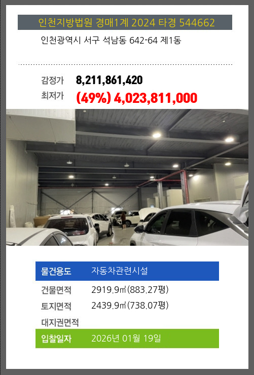 | 용도 | 자동차관련시설 | 채권자 | 중** | 감정가 | 8,211,861,420 |