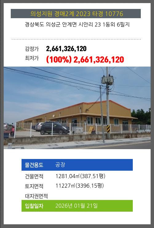 | 소재지 | [지번] 경상북도 의성군 안계면 시안리 23 1동외 6필지 [도로명 주소] 경상북도 의성군 안계면 서부로 1776-21 1동외 6필지 |