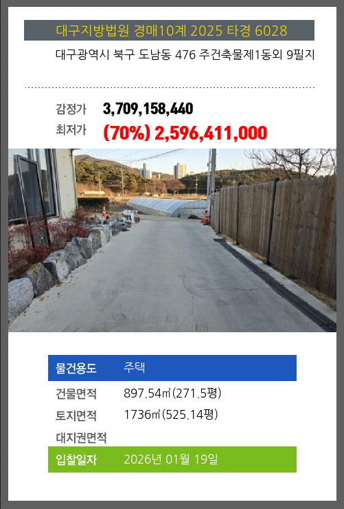 | 소재지 | [지번] 대구광역시 북구 도남동 476 주건축물제1동외 9필지 [도로명 주소] 대구광역시 북구 도남길 193-42(도남동) 주건축물제1동외 9필지 |