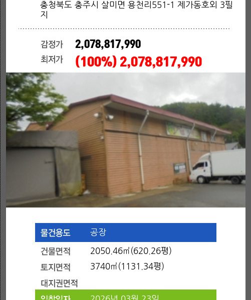 | 건물면적 | 6016.64㎡ (1820.03평) | 채무자 | 농** | 최저가 | (80%) 2,505,616,000 |