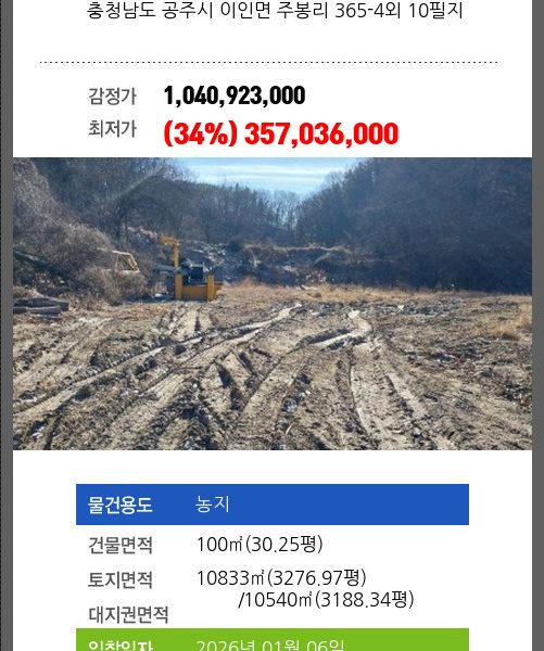 | 토지면적 | 4712㎡ (1425.37평) | 소유자 | 김**외1명 | 보증금 | (10%) 252,605,090 |