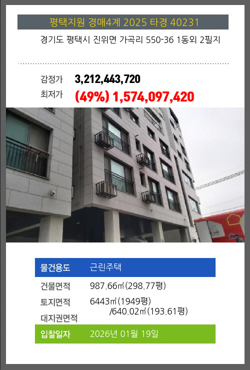 | 용도 | 근린주택 | 채권자 | 임** | 감정가 | 3,212,443,720 |