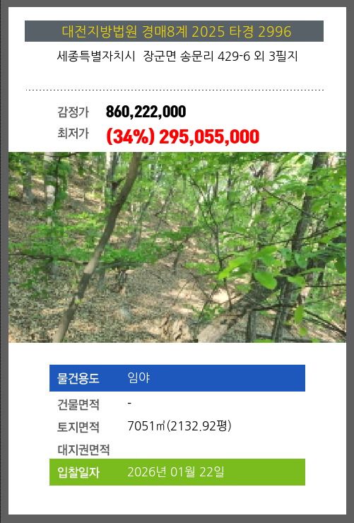 | 소재지 | [지번] 세종특별자치시 장군면 송문리 429-6 외 3필지 | ||||