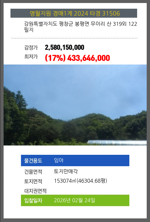 평창임야경매 평창군 봉평면 무이리 산 319외 122필지 №2024 타경 31506