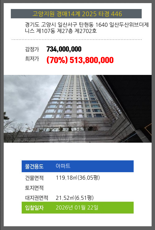 고양아파트경매 고양시 일산서구 탄현동 1640 일산두산위브더제니스 제107동 제27층 제2702호 №2025 타경 446