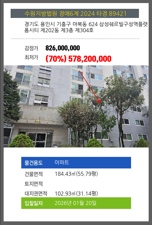 본건은 경기도 용인시 기흥구 마북동 624 삼성쉐르빌구성역플랫폼시티 제202동 제3층 제304호