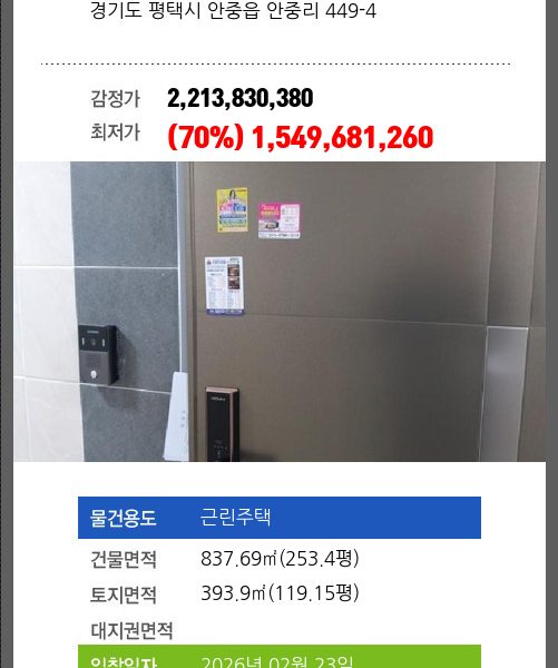 | 매각대상 | 공시가격2~3억 | 경매종류 | 임의경매 | 사건접수일 | 2025-01-13 |