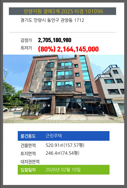 | 건물면적 | 520.91㎡ (157.57평) | 채무자 | 박** | 최저가 | (80%) 2,164,145,000 |