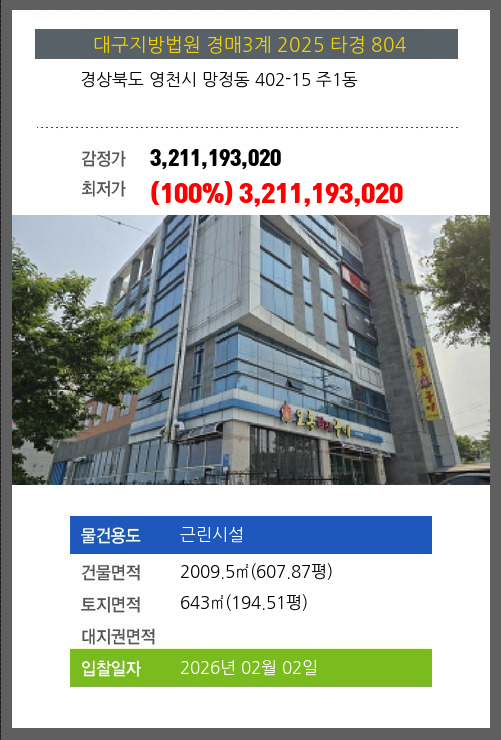 | 용도 | 근린시설 | 채권자 | 경** | 감정가 | 3,211,193,020 |