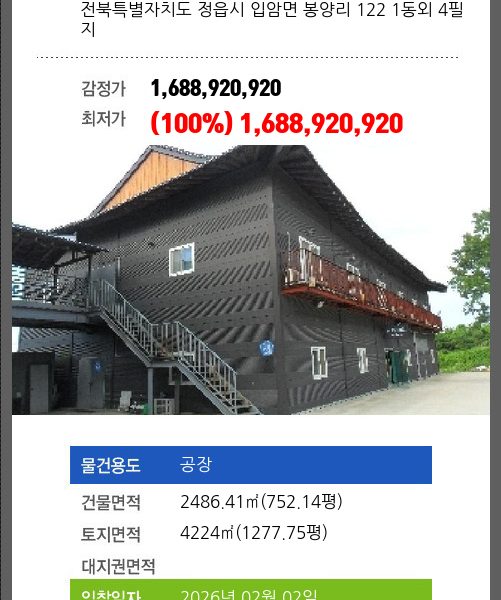 | 용도 | 공장 | 채권자 | 농** | 감정가 | 5,373,071,320 |