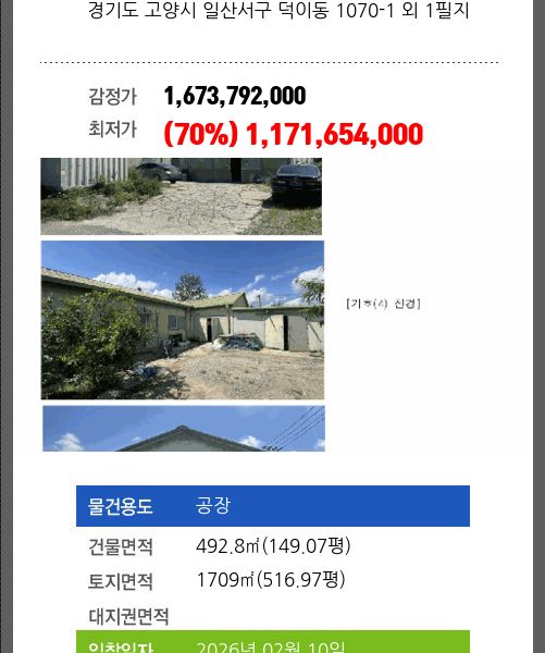 | 건물면적 | 2663.1㎡ (805.58평) | 채무자 | ㈜** | 최저가 | (34%) 1,704,879,000 |