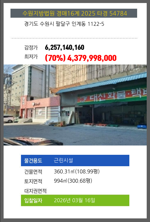 수원시설경매 수원시 팔달구 인계동 1122-5 №2025 타경 54784