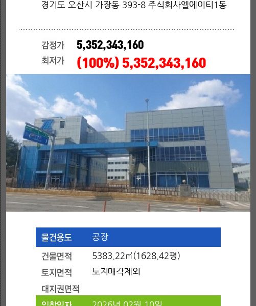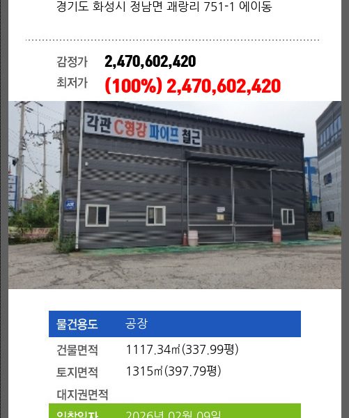 | 건물면적 | 360.31㎡ (108.99평) | 채무자 | 김** | 최저가 | (100%) 6,257,140,160 |