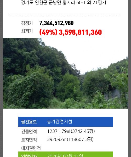 | 토지면적 | 5271㎡ (1594.47평) | 소유자 | 제** | 보증금 | (10%) 525,109,698 |
