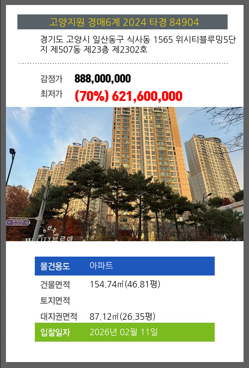 본건은 경기도 고양시 일산동구 식사동 1565 위시티블루밍5단지 제507동 제23층 제2302호