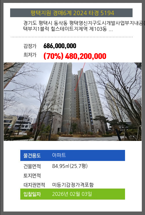| 건물면적 | 84.95㎡ (25.7평) | 채무자 | 최** | 최저가 | (70%) 480,200,000 |