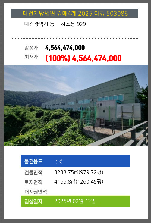 | 용도 | 공장 | 채권자 | ㈜** | 감정가 | 4,564,474,000 |