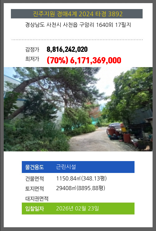 | 용도 | 근린시설 | 채권자 | 사** | 감정가 | 8,816,242,020 |