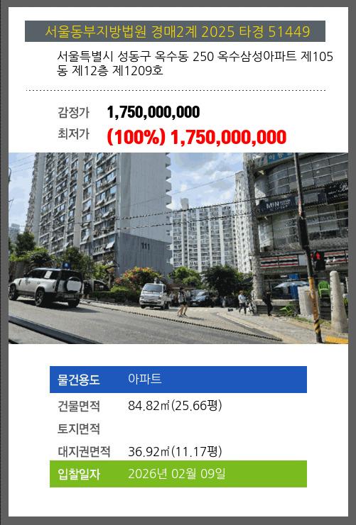 | 건물면적 | 84.82㎡ (25.66평) | 채무자 | 김**외1명 | 최저가 | (100%) 1,750,000,000 |