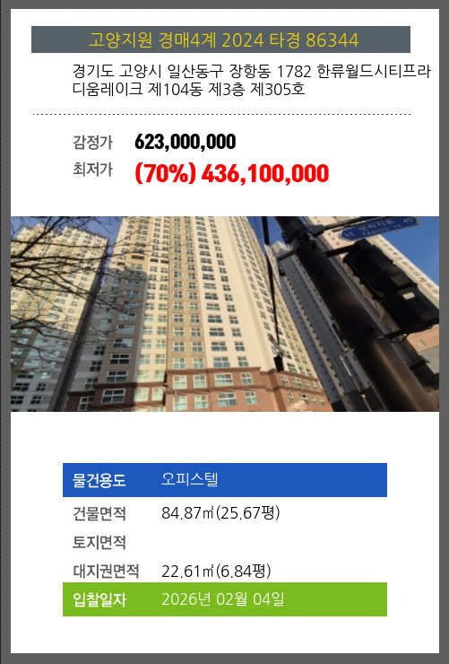 고양오피스텔경매 고양시 일산동구 장항동 1782 한류월드시티프라디움레이크 제104동 제3층 제305호 №2024 타경 86344