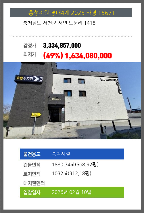 | 용도 | 숙박시설 | 채권자 | 충**외1명 | 감정가 | 3,334,857,000 |