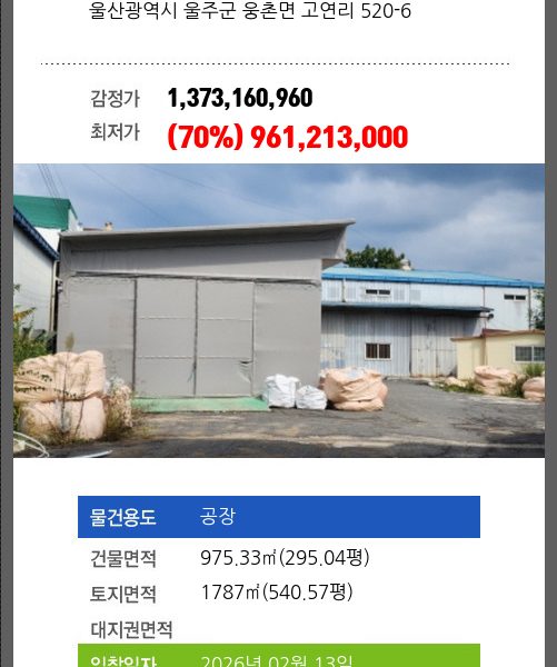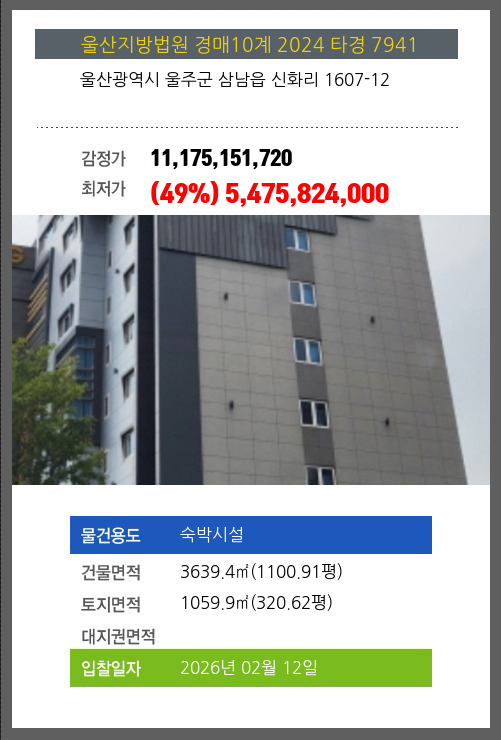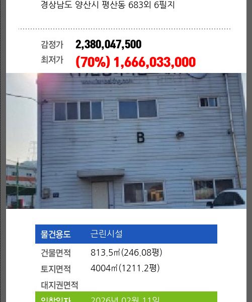 | 건물면적 | 3639.4㎡ (1100.91평) | 채무자 | 김** | 최저가 | (49%) 5,475,824,000 |