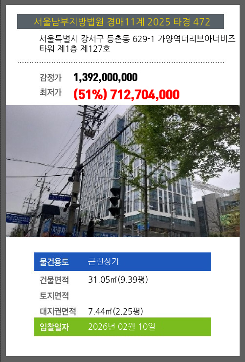 강서상가경매 강서구 등촌동 629-1 가양역더리브아너비즈타워 제1층 제127호 №2025 타경 472