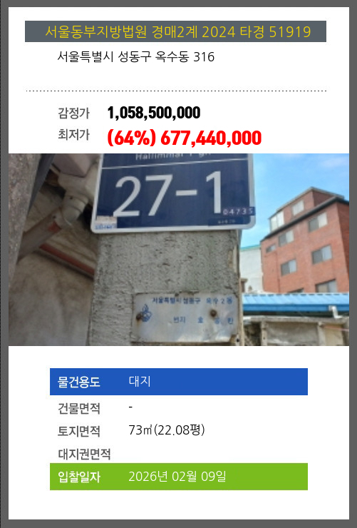토지면적 73㎡ (22.08평) 소유자 옥** 보증금 (10%) 67,744,000