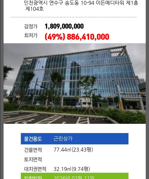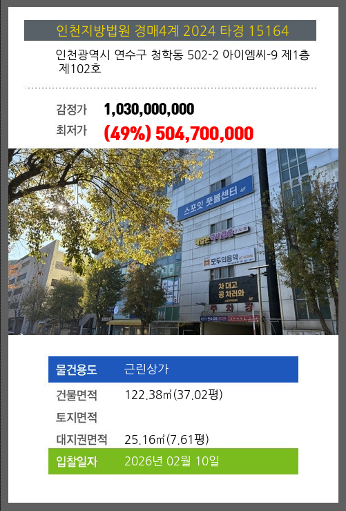 본건은 인천광역시 연수구 청학동 502-2 아이엠씨-9 제1층 제102호