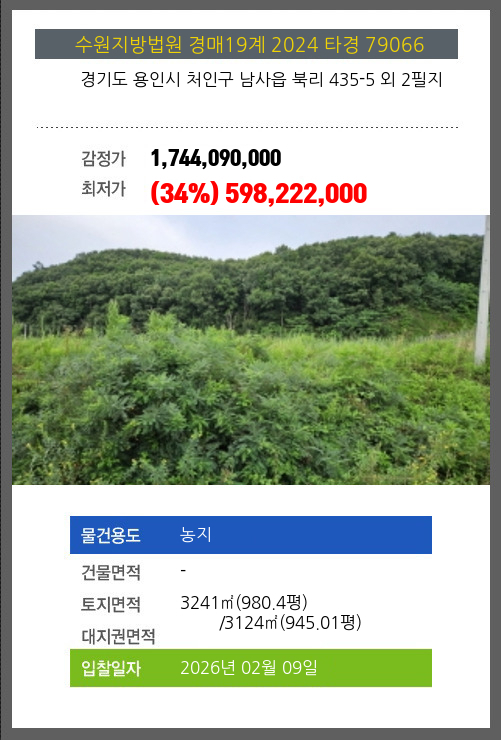 | 소재지 | [지번] 경기도 용인시 처인구 남사읍 북리 435-5 외 2필지 | ||||