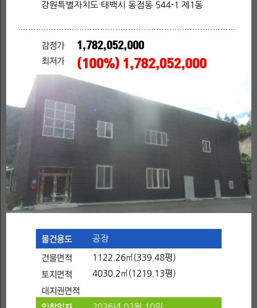 | 건물면적 | 826.25㎡ (249.94평) | 채무자 | 태** | 최저가 | (49%) 632,080,000 |