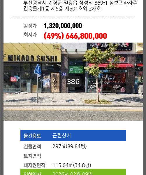 | 건물면적 | 455.85㎡ (137.89평) | 채무자 | ㈜** | 최저가 | (70%) 644,860,200 |