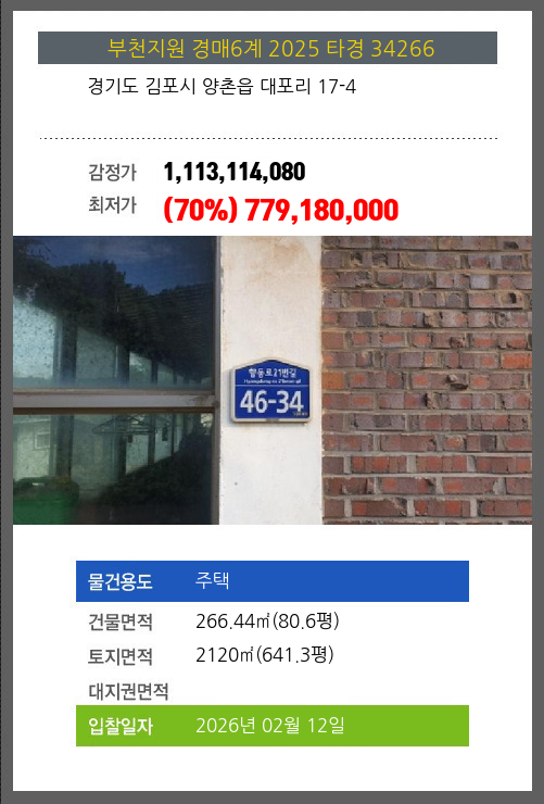 | 건물면적 | 266.44㎡ (80.6평) | 채무자 | 박** | 최저가 | (70%) 779,180,000 |