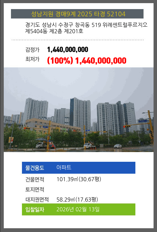 성남아파트경매 성남시 수정구 창곡동 519 위례센트럴푸르지오 제5404동 제2층 제201호 №2025 타경 52104