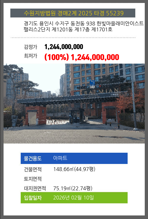 용인아파트경매 용인시 수지구 동천동 938 한빛마을래미안이스트팰리스2단지 제1201동 제17층 제1701호 №2025 타경 55239
