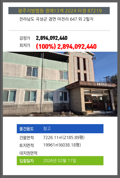 곡성창고경매 곡성군 겸면 마전리 647 외 2필지 №2024 타경 87219