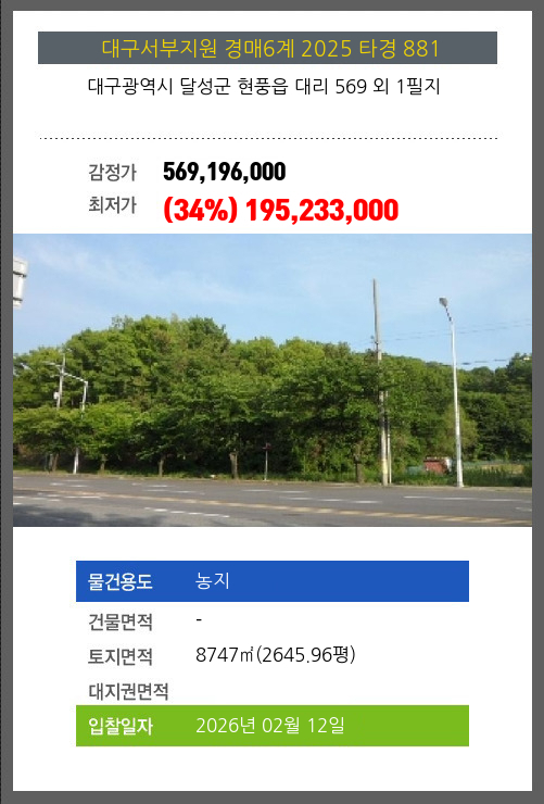 | 소재지 | [지번] 대구광역시 달성군 현풍읍 대리 569 외 1필지 | ||||