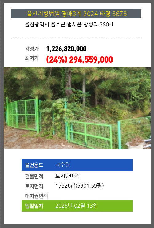 | 용도 | 과수원 | 채권자 | 울** | 감정가 | 1,226,820,000 |